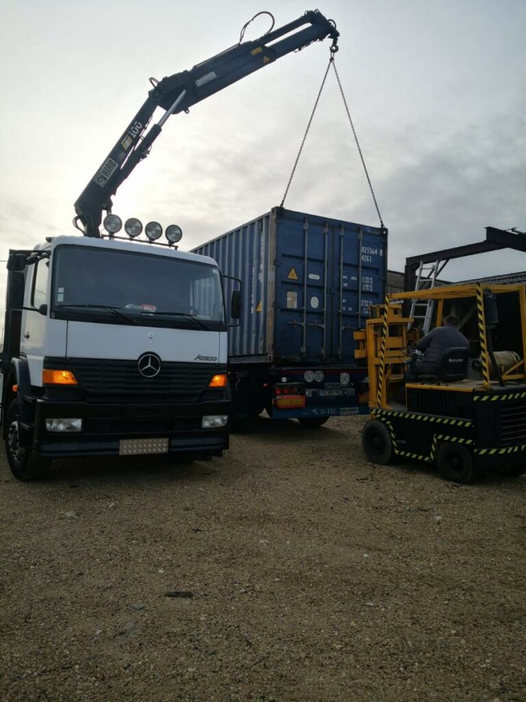 • Container maritime 20 pieds bleu en forêt avec camion grue DE LIMA